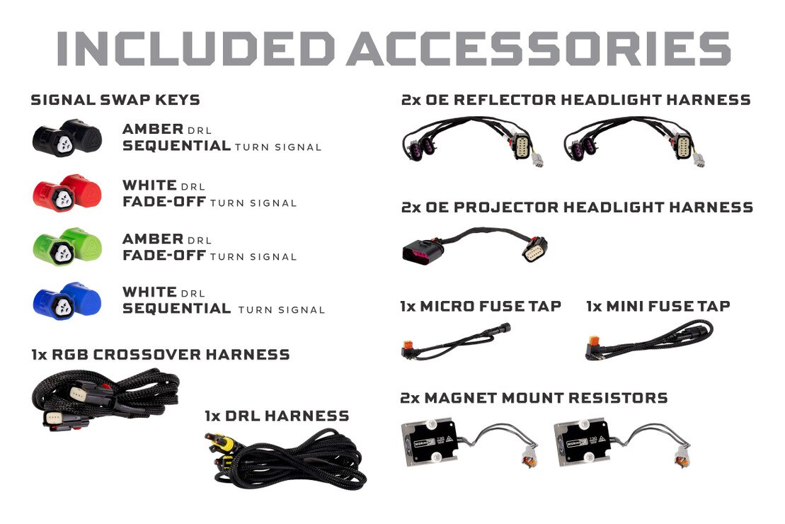 • Accessories : 1x Mini Fuse Tap, 1x Micro Fuse Tap, 1x DRL Harness, 2x Magnet-Mount Resistors, 2x OE Reflector Headlight Harnesses, 2x OE Projector Headlight Harnesses, 1x RGB Crossover Harness, 8x (4 Pairs) DRL / Signal Mode Selectors