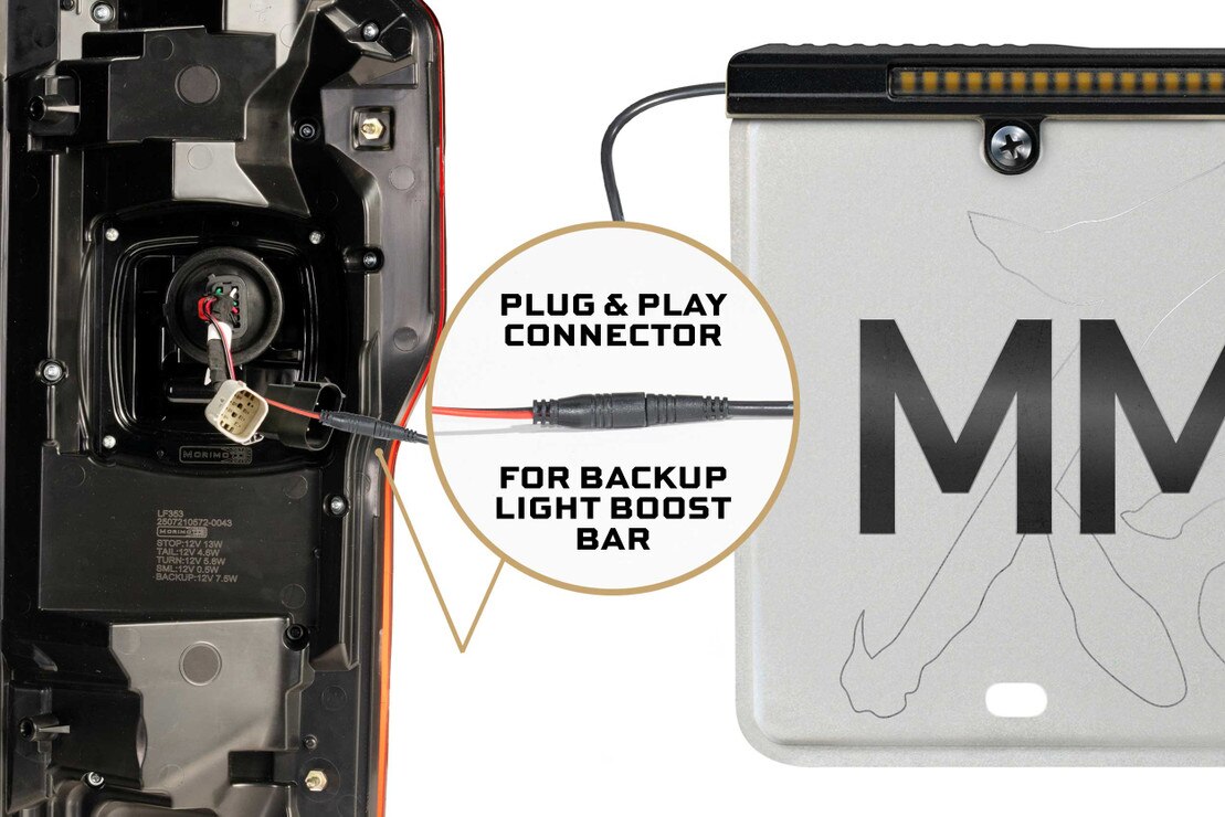 Reverse Lights: We've increased the performance of the reverse lights over stock, but if that's not enough, the optional Backup Light Boost Bar adds an additional 2,700 lumens of darkness-destroying output via a simple plug and play connection on the tail light.