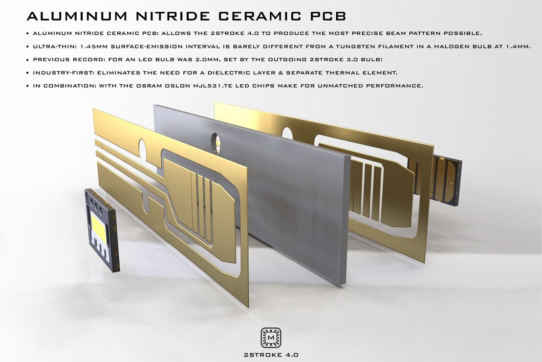 Superior Beam Quality: The advanced Aluminum Nitride Ceramic circuit board in the center of the 2S4 sets allows the bulbs to produce the most precise beam pattern possible, with its 1.45mm surface-emission interval. For reference, the tungsten filament in a halogen bulb is 1.4mm, and the previous record for an LED bulb was 2.0mm, set by the outgoing 2Stroke 3.0 bulb! Using the industry-first ceramic PCB, we have eliminated the need for the dielectric layer and a separate thermal element, which, in combination with the Osram Oslon HJL531.TE LED chips makes for unmatched performance when used in all reflector and projector-based headlights designed for halogen bulbs.